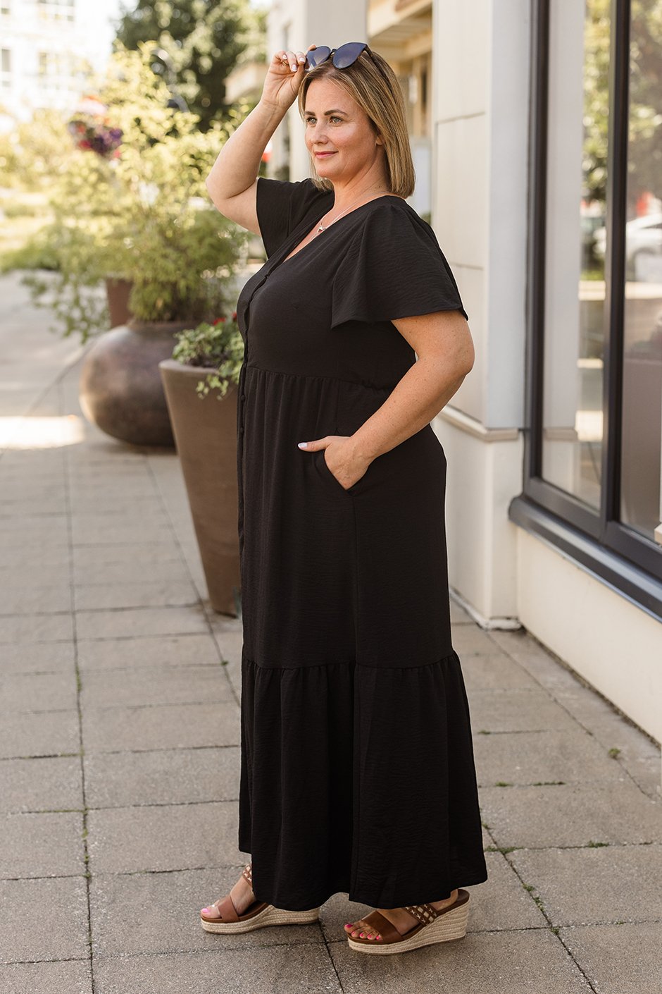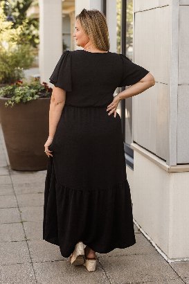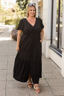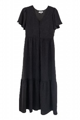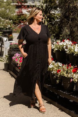 This dress is absolutely beautiful. The tiered design adds a playful and elegant touch, while the length makes it perfect for any occasion. The ruffle sleeves are feminine and flirty. The fabric is a soft almost medium weight with the lining, ensuring comfort throughout the day. The little peek-a-boo slit is my fav. And of course, pockets! Wearing the XL and liked the fit! Because it has functional buttons, and I’m busty, it gaped just a little bit in the bust, nothing to be too concerned about when wearing the appropriate colour bra.