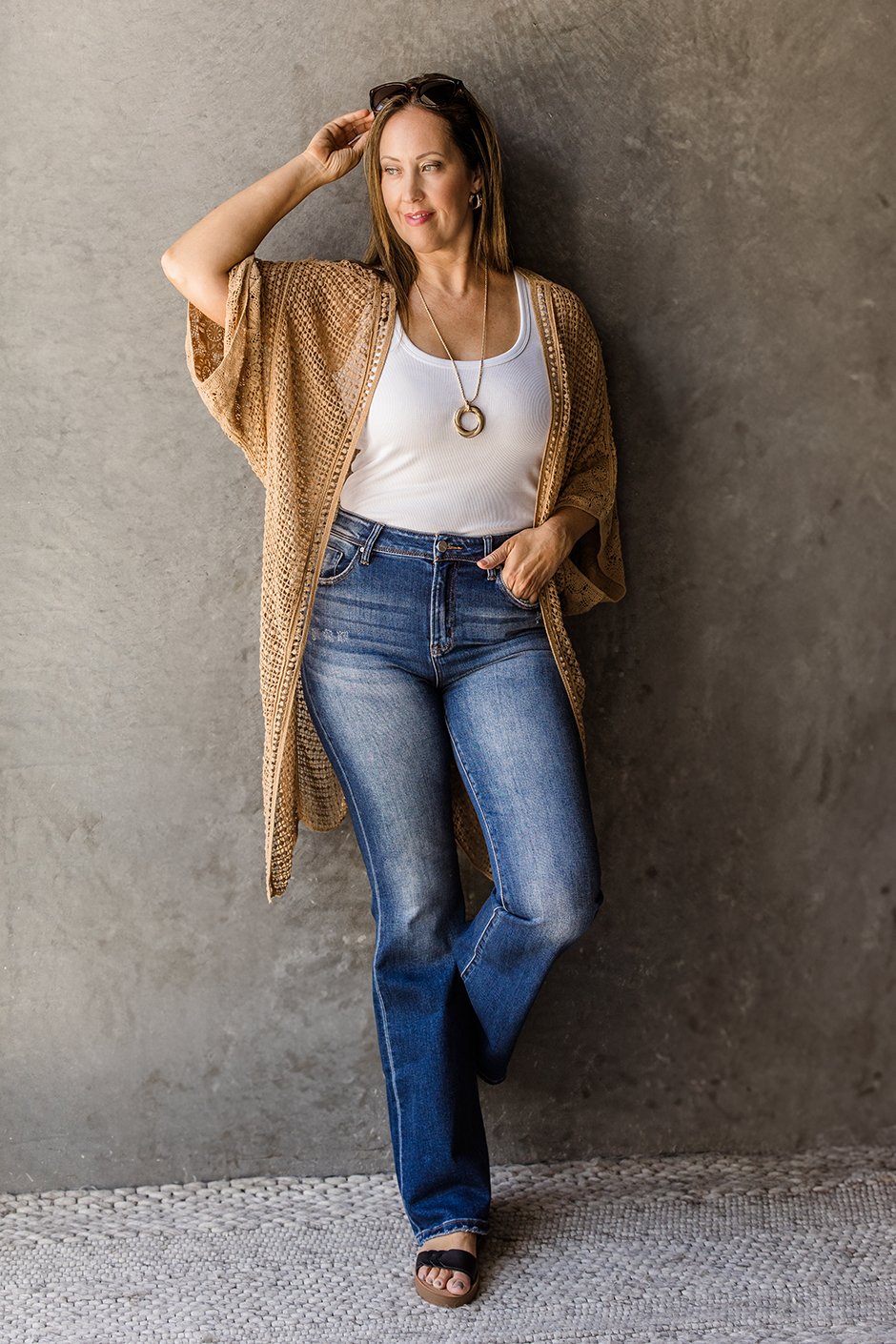I have officially found the perfect denim for my 5'9" long torso frame! These beauties have an 11" rise and 33" inseam...absolute perfection for me. I love both the light or dark blue wash in this bootcut style. I am new to trying the Risen brand and I'm wearing a size 9 here. They are perfectly fitted, especially at my bum. If I wanted more of a relaxed fit then I'd need to size up.