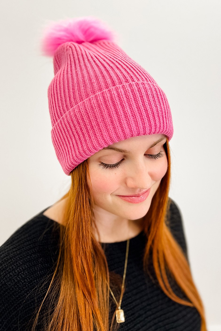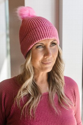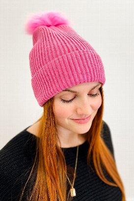 This stylish toque features a fold on the edge and an adorable fur ball on the top. Perfect for chilly days, this toque is a great way to stay warm while adding a unique touch to your look. Style it with a long coat, skinny jeans, and ankle boots for a chic winter outfit.