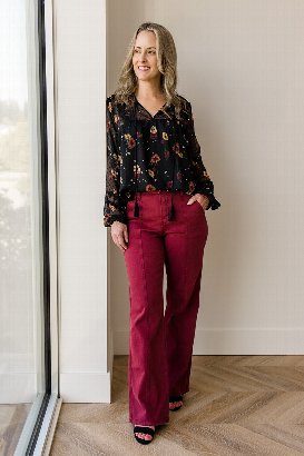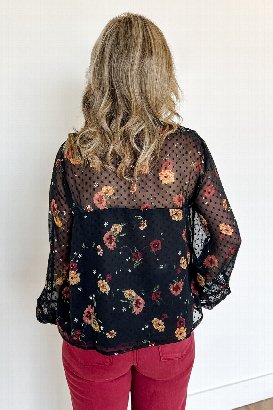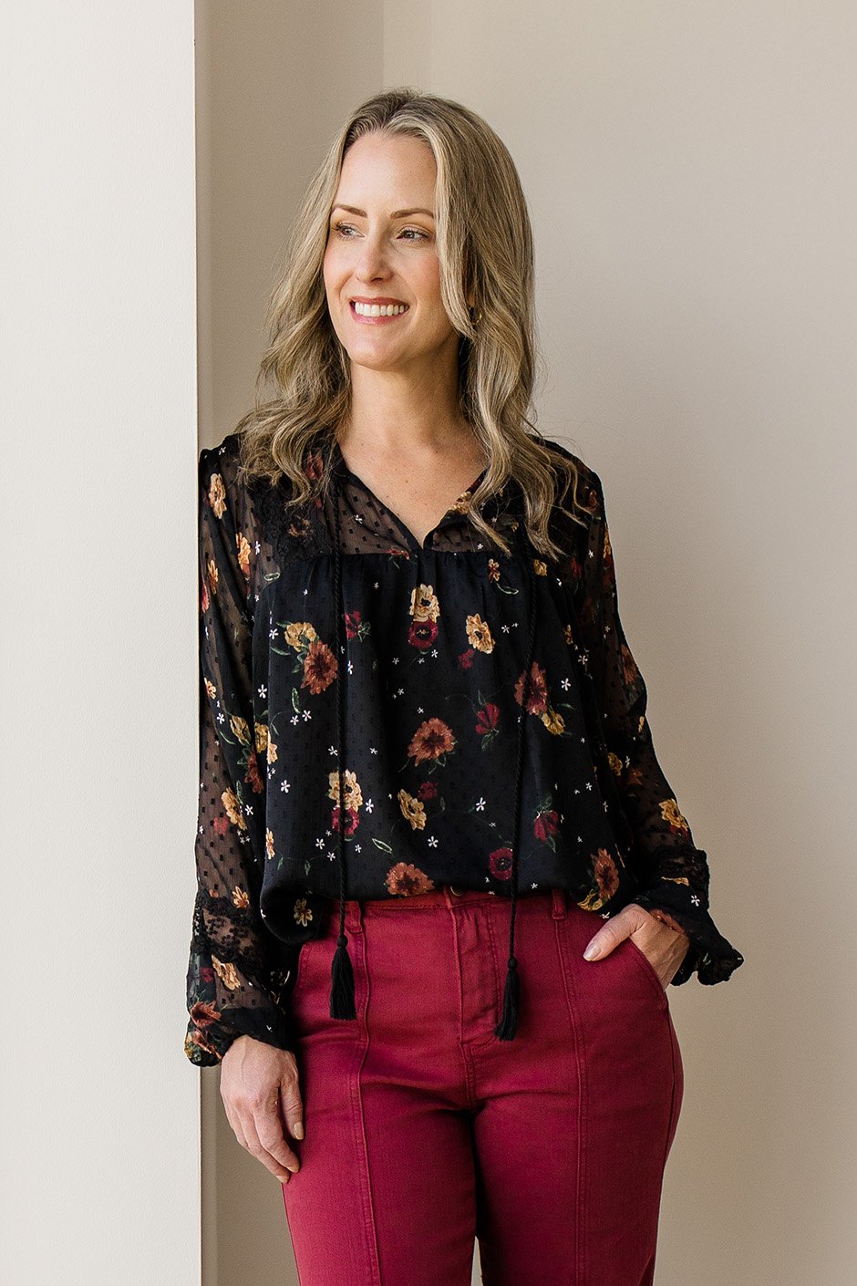 This top instantly gives off that effortless, polished vibe! The new floral pattern that's launching is seriously stunning, so delicate and elevated. I wore a size Small and the fit was perfect, flowy, flattering, and easy to style!
