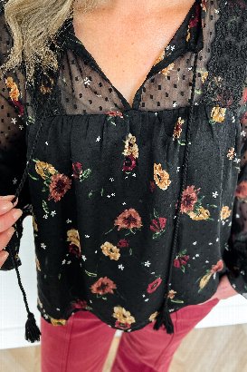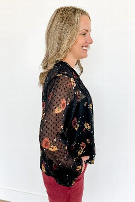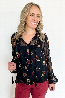 Okay, this sheer flowy tie-neck top totally surprised me! It’s not usually my style, but I’m wearing my typical size L and absolutely loved how it looked. The fabric flowed really nice making it super easy to dress up or down. If you’re looking to try something new and fun, this top is definitely worth a go!