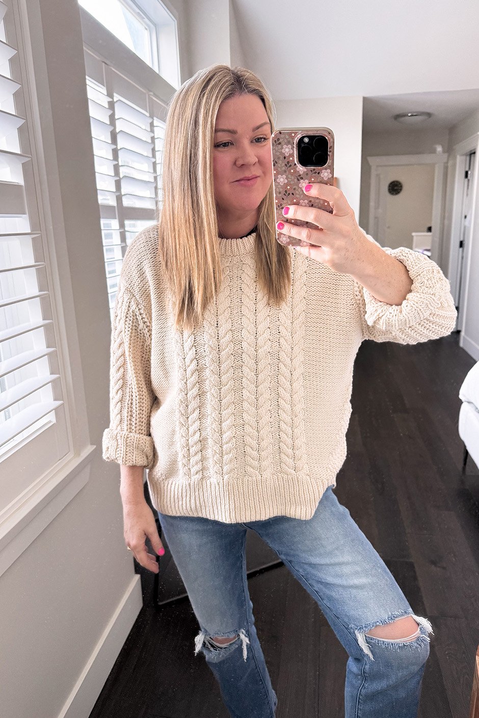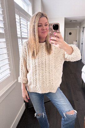 I’m wearing a size medium, and the relaxed fit is just what I was looking for. The thick quality fabric feels incredibly cozy and warm, and the cable knit design adds a beautiful texture that really elevates the whole vibe. It’s the kind of sweater that will never go out of style, and I can see myself wearing it all season long!